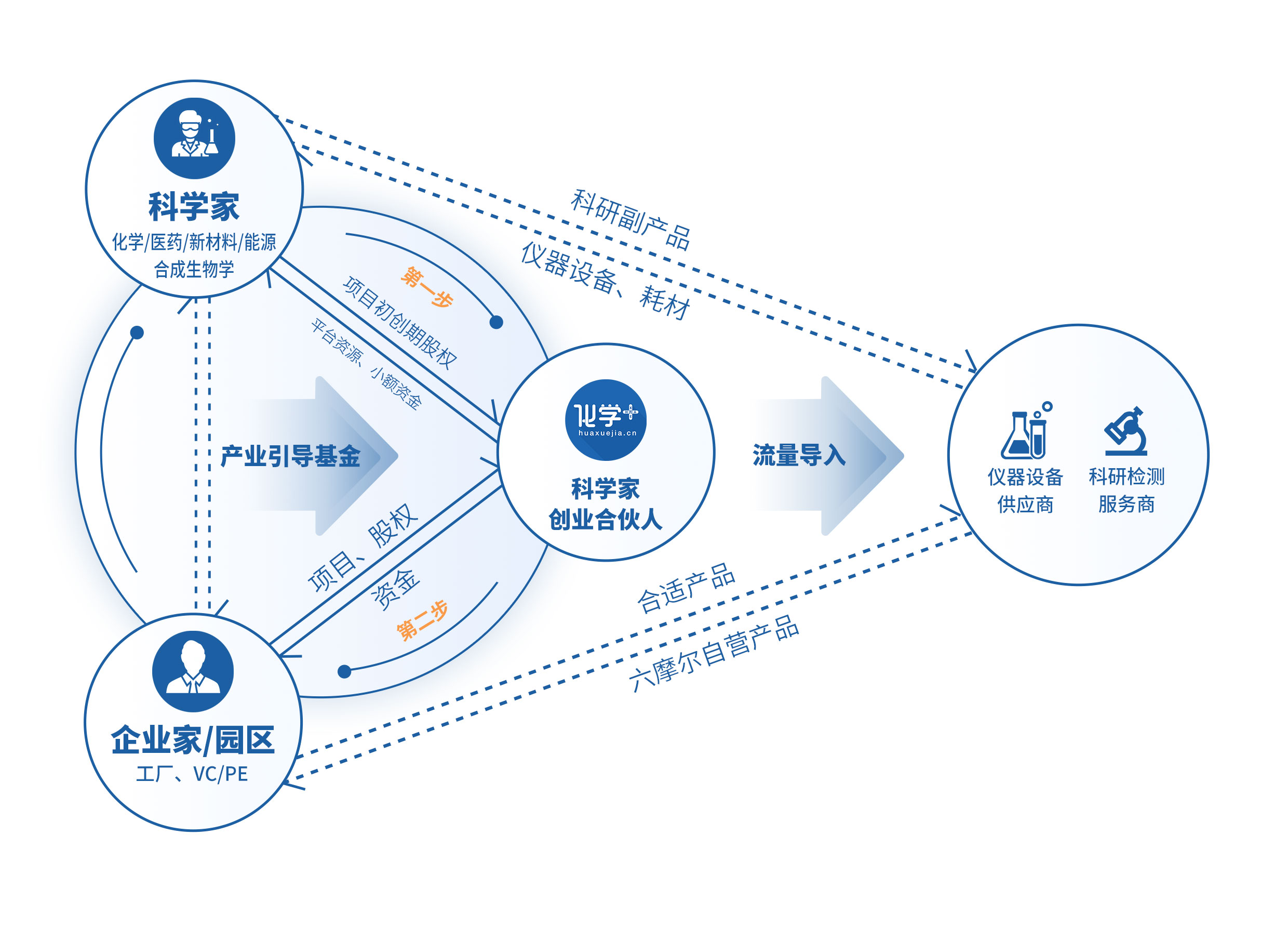 作為科學家創(chuàng)業(yè)合伙人這一角色,在科學家的橫向研究、創(chuàng)業(yè)項目、創(chuàng)業(yè)公司初始階段,化學加可以起到關鍵的角色互補作用,為項目、為科學家提供包括市場調研、企業(yè)需求對接、融資對接、園區(qū)入駐、品牌營銷(IP打造)、人才推薦等服務。