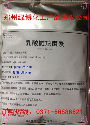 簡介  乳酸鏈球菌素(Nisin)亦稱乳酸鏈球菌肽或音譯為尼辛,是乳酸鏈球菌產(chǎn)生的一種多肽物質(zhì),由34個氨基酸殘基組成。食用后在人體的生理pH條件和α—胰凝乳蛋白酶作用下很快水解成氨基酸,不會改變?nèi)梭w腸道內(nèi)正常菌群以及產(chǎn)生如其它抗菌素所出現(xiàn)的抗性問題,更不會與其它抗菌素出現(xiàn)交叉抗性,是一種高效、無毒、安全、無副作用的天然食品防腐劑??蓮V泛應(yīng)用于肉制品、乳制品、罐頭、海產(chǎn)品、飲料、果汁飲料、液體蛋及蛋制品、調(diào)味品、釀酒工藝、烘焙食品、方便食品、香基香料、化妝品領(lǐng)域等中。