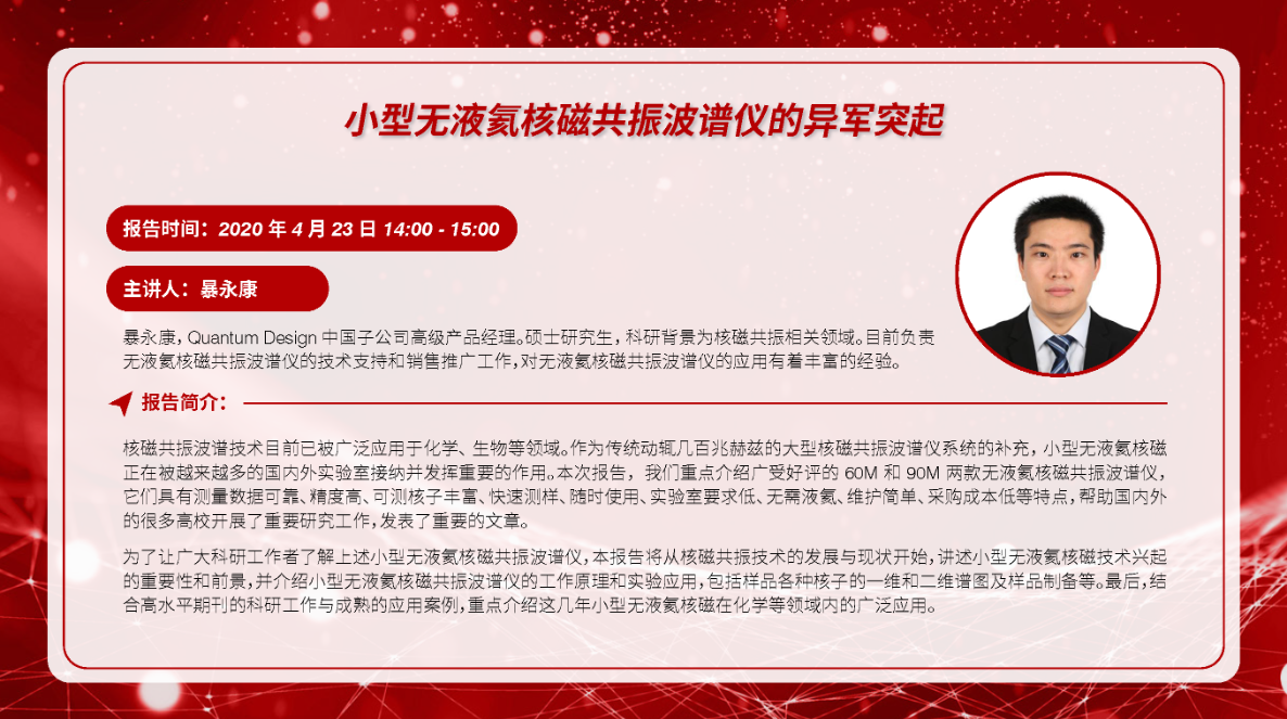 暴永康,Quantum Design中國子公司高級(jí)產(chǎn)品經(jīng)理。碩士研究生,科研背景為核磁共振相關(guān)領(lǐng)域。目前負(fù)責(zé)無液氦核磁共振波譜儀的技術(shù)支持和銷售推廣工作,對(duì)無液氦核磁共振波譜儀的技術(shù)及應(yīng)用積累了多年豐富經(jīng)驗(yàn)。