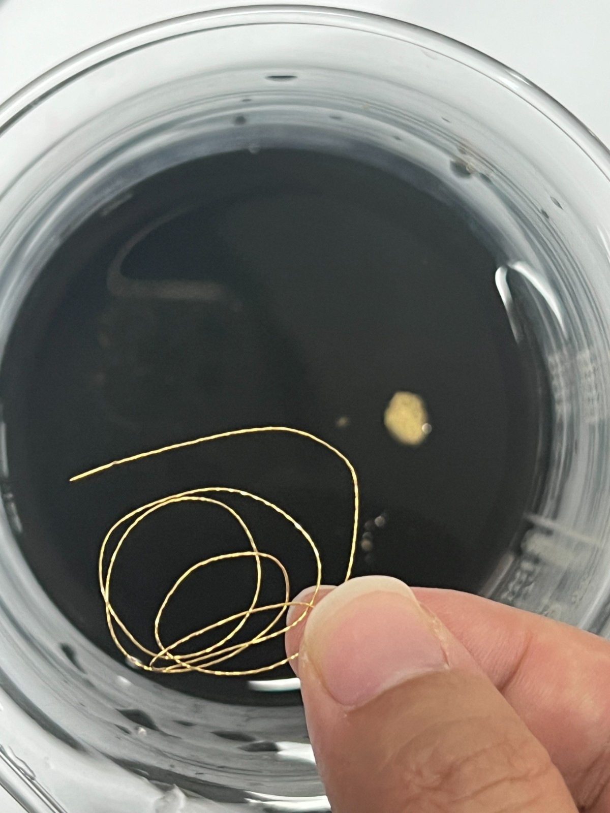 【客戶案例】客戶寄來一段直徑 0.2mm的金絲,我們使用SixMol 納米金屬粉末制造設(shè)備,在去離子水中,通過電爆法將金絲制備成膠體溶液,后續(xù)把溶液經(jīng)過過濾干燥就可以得到納米級金粉。