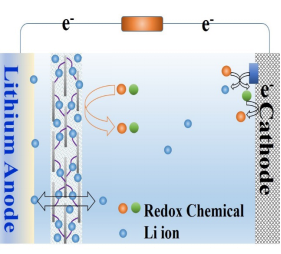 圖:高鋰離子含量隔膜阻隔氧化還原分子在正負(fù)極穿梭的示意圖