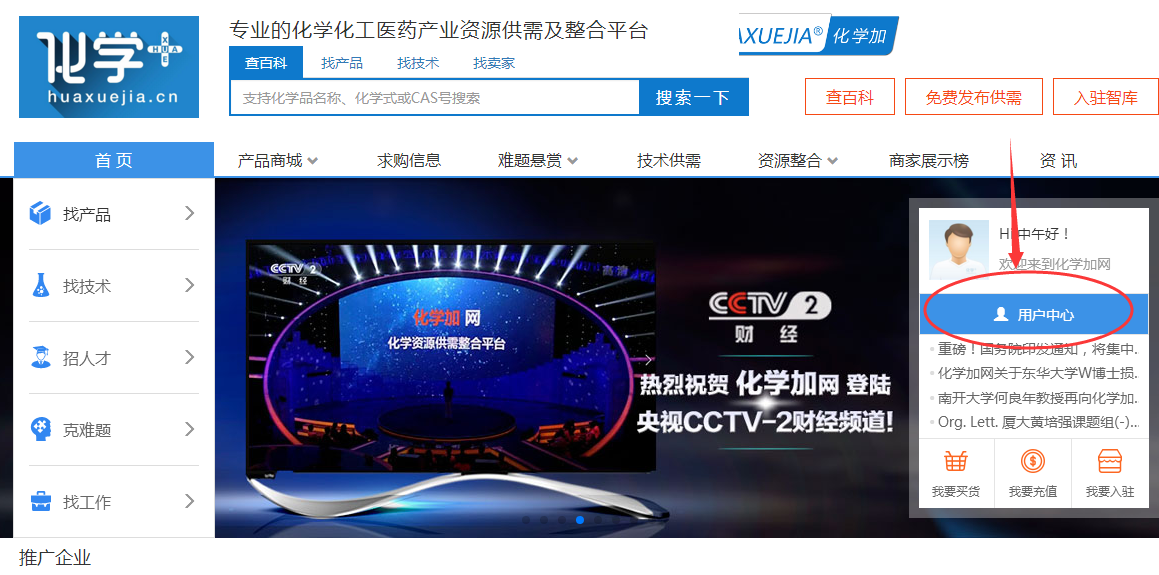 步驟三:設(shè)定好拳頭產(chǎn)品之后,返回化學(xué)加首頁。將鼠標(biāo)移動(dòng)到“產(chǎn)品商城”上,會(huì)顯示下拉菜單,點(diǎn)擊“拳頭產(chǎn)品”進(jìn)入。