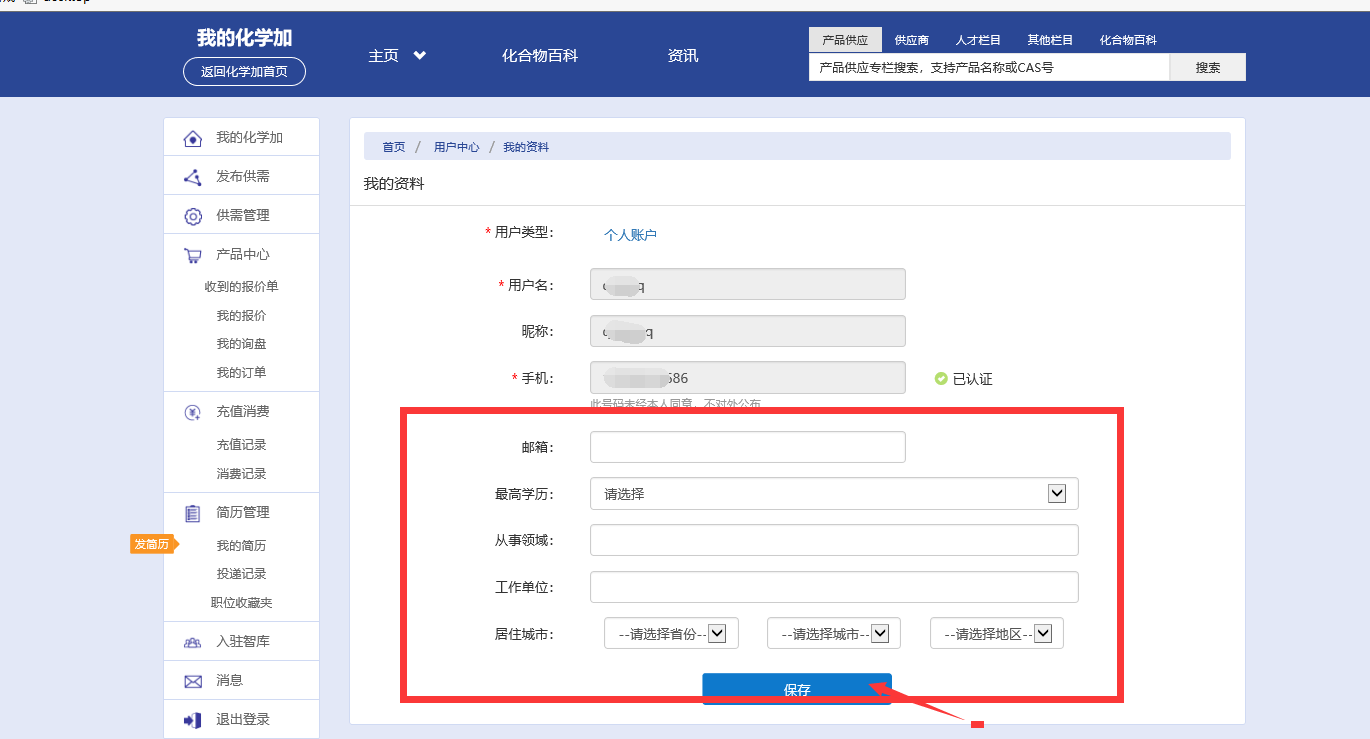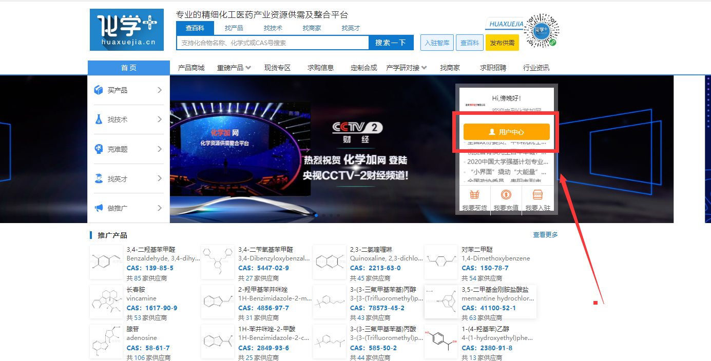 步驟二:注冊(cè)好之后在化學(xué)加網(wǎng)首頁點(diǎn)開“用戶中心”。