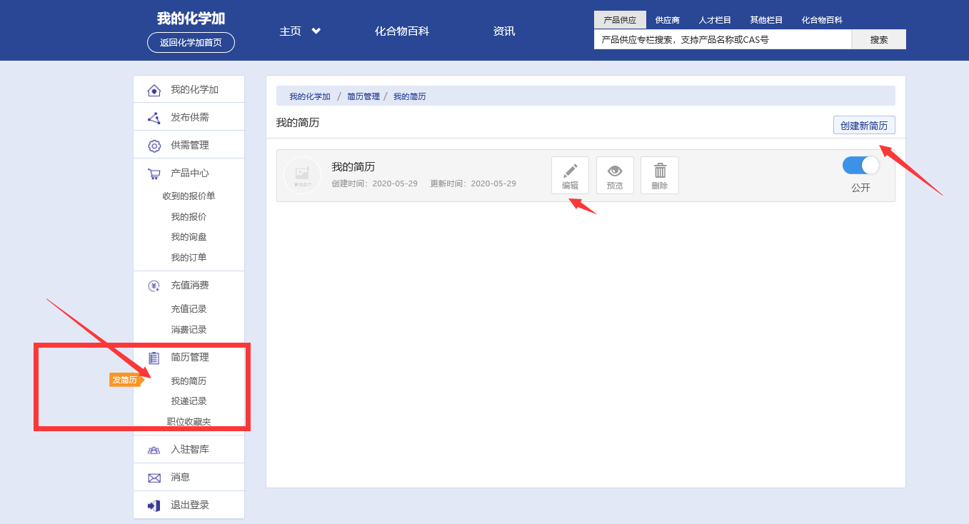 步驟四:在左下角“簡歷管理”中,點(diǎn)擊“我的簡歷”創(chuàng)建新簡歷。進(jìn)入編輯頁面,填寫相關(guān)信息。保存、預(yù)覽。
