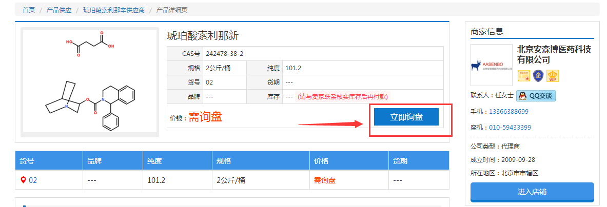 針對(duì)于沒(méi)有價(jià)格的產(chǎn)品,下單前需要詢(xún)盤(pán)。您可以點(diǎn)擊“立即詢(xún)盤(pán)”,填寫(xiě)好詢(xún)價(jià)信息并提交。供應(yīng)商登錄之后就可以看到您的詢(xún)盤(pán)請(qǐng)求,向您報(bào)價(jià)。您也可以在店鋪中看到供應(yīng)商的聯(lián)系方式,直接電話或QQ詢(xún)盤(pán),說(shuō)明是在化學(xué)加網(wǎng)上看到的。如圖所示。