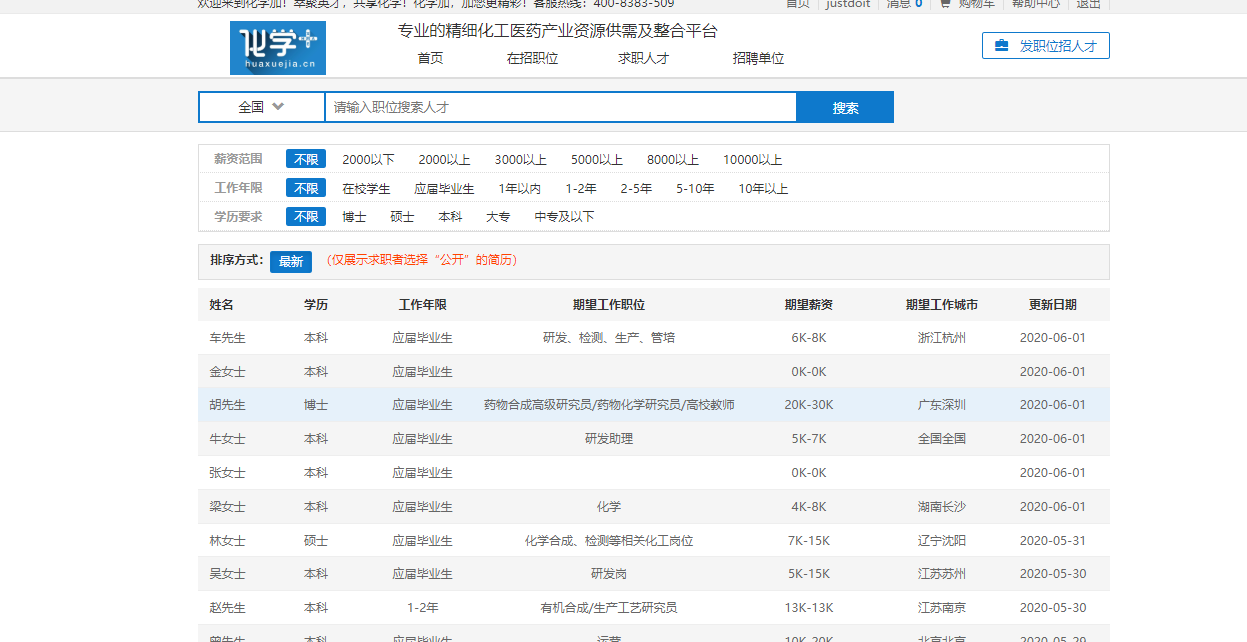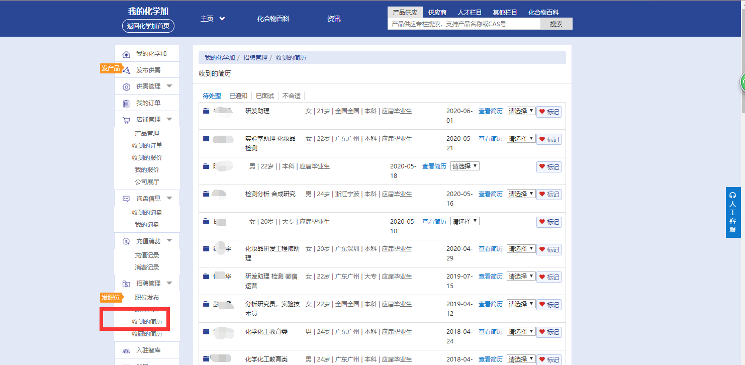 步驟六:企業(yè)用戶登錄化學(xué)加后可查看到已經(jīng)公開的求職者的簡歷。在“在招職位”和“招聘單位”中可以查看到自己發(fā)布的招聘信息。