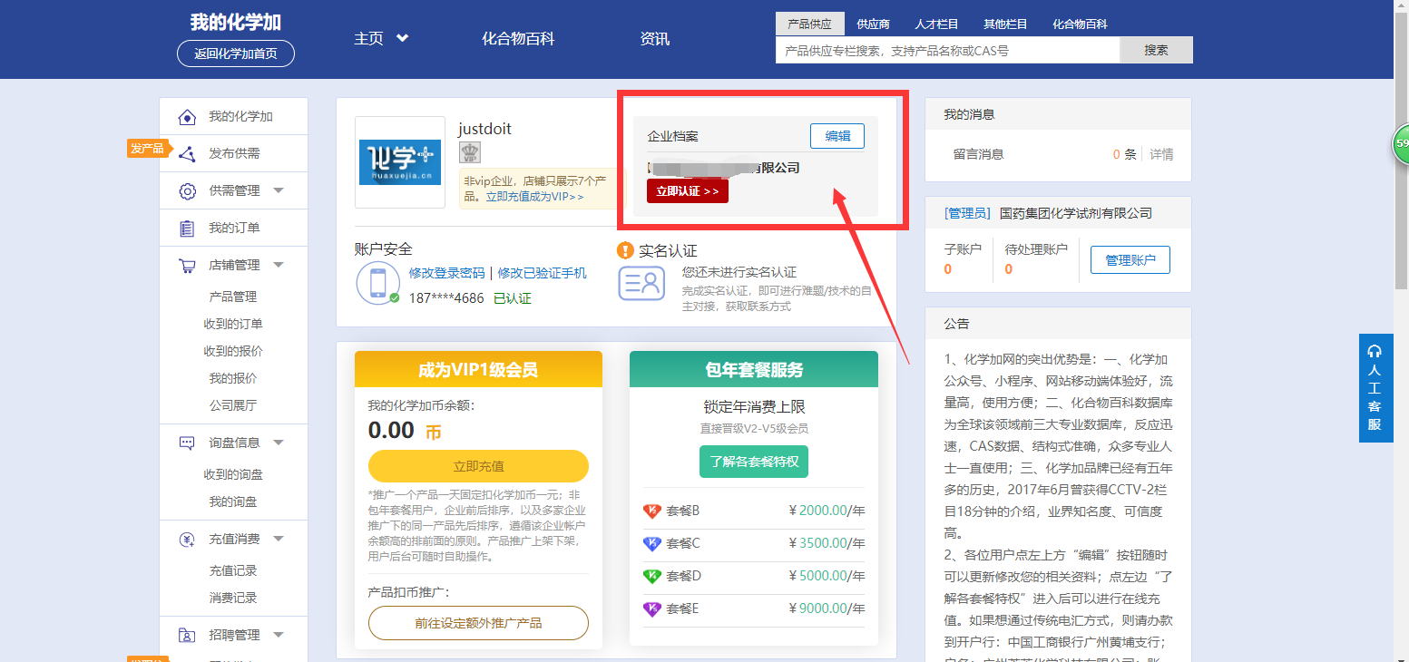 步驟三:進入“用戶中心”,點擊“立即認(rèn)證”編輯完善企業(yè)信息,提交認(rèn)證。