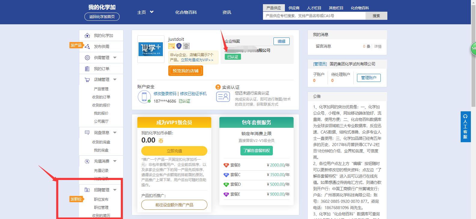 步驟四:審核通過后企業(yè)狀態(tài)顯示已認(rèn)證,在左下角“招聘管理”中,點擊“職位發(fā)布”發(fā)布招聘信息。確認(rèn)并發(fā)布之后,化學(xué)加工作人員會盡快審核。