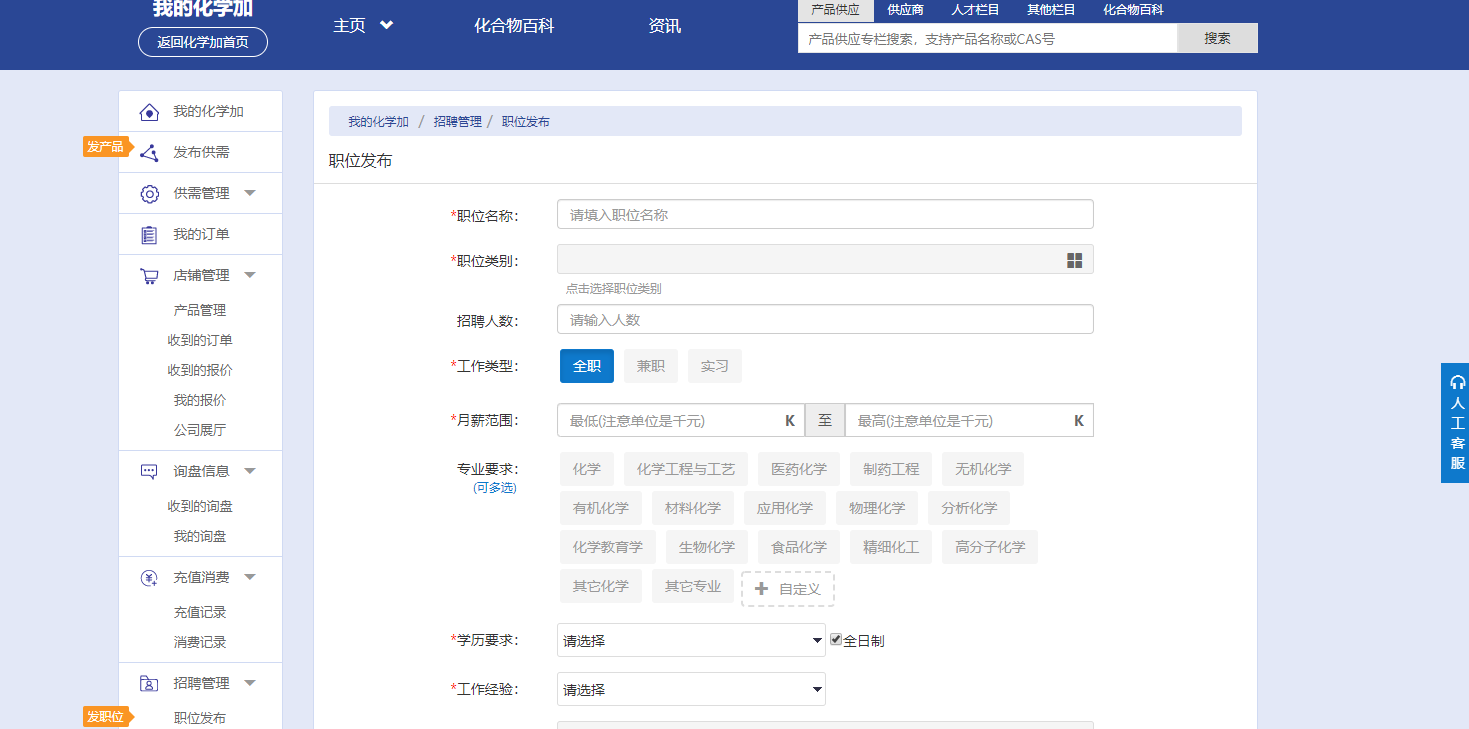 企業(yè)會員發(fā)布招聘,先在化學(xué)加網(wǎng)注冊“機構(gòu)/企業(yè)賬戶”,注冊后進入用戶中心,完善企業(yè)信息提交認(rèn)證,審核通過后即可免費發(fā)布招聘信息。
