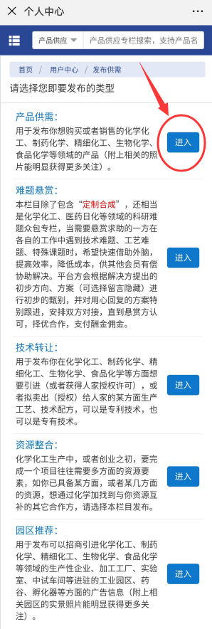 2.進入發(fā)布供需的頁面之后,按照各個欄目的說明,發(fā)布自己所需要發(fā)布的信息。想發(fā)布產(chǎn)品就點擊產(chǎn)品供需的“進入”按鈕。