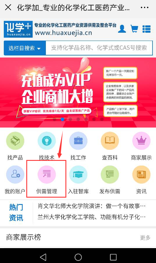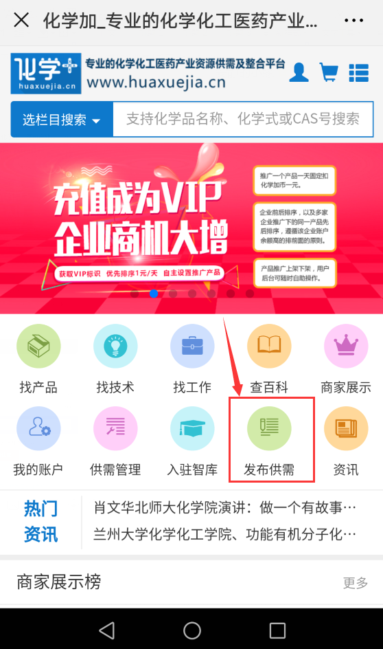 2.關(guān)注微信公眾號化學(xué)加,菜單欄右下角即有“化學(xué)加網(wǎng)”按鈕,點擊即可進入。