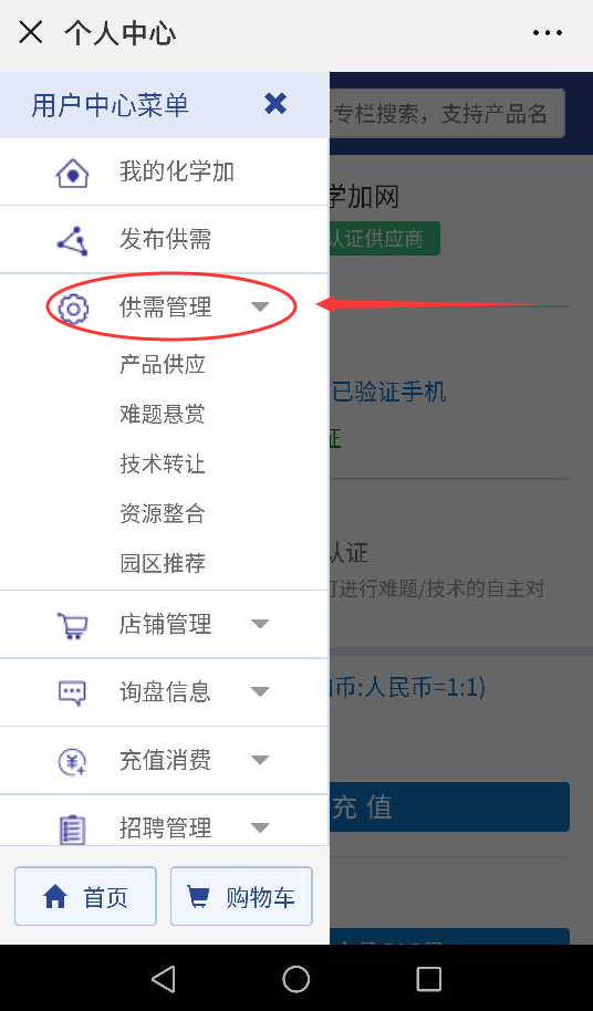 2.在個人中心頁面,點擊左上角的書柜按鈕,展開用戶中心菜單,點擊一下供需管理,再根據(jù)想查看的欄目點擊相應(yīng)欄目進入。
