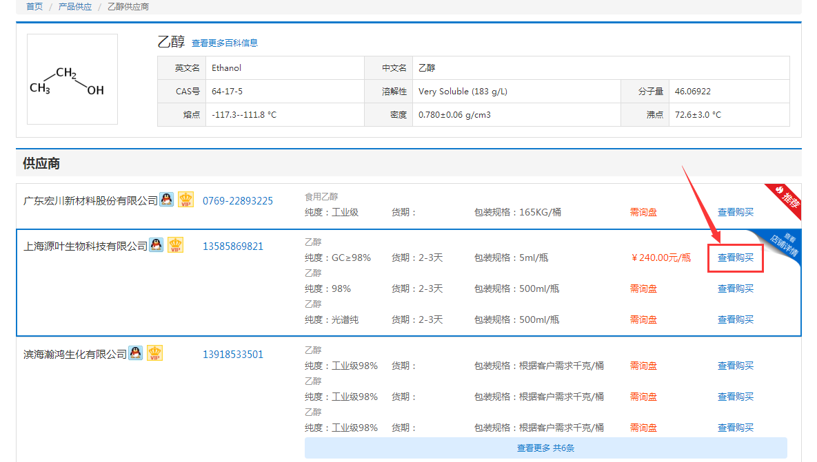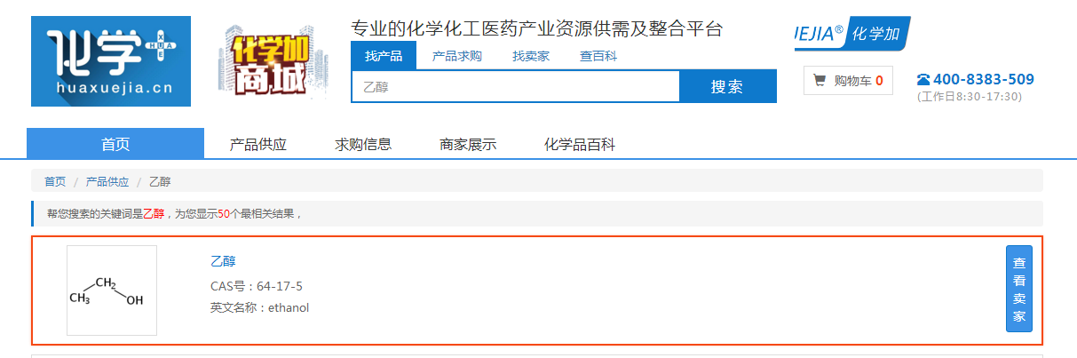步驟一:登錄化學(xué)加網(wǎng)之后,在搜索欄“找產(chǎn)品”一項,輸入您要尋找的產(chǎn)品中文名或者CAS號,搜索結(jié)果出來后,點擊結(jié)果右側(cè)的“查看賣家”,如圖所示。