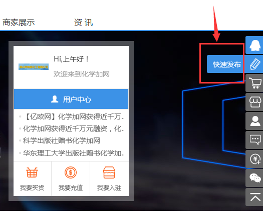 步驟一:登錄后,進(jìn)行產(chǎn)品發(fā)布有以下兩種方式:1、可以通過點(diǎn)擊首頁右方便捷欄的第二個(gè)按鈕“快速發(fā)布”,如圖所示。