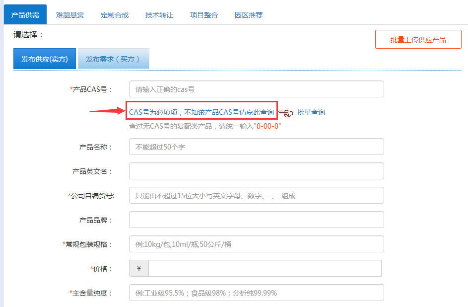 步驟二:在發(fā)布產(chǎn)品的頁面,按照填寫提示來發(fā)布產(chǎn)品。其中,帶*的為必填項(xiàng)目,其余為選填項(xiàng)目,建議都填寫完整并上傳圖片。CAS號不知道的,可以點(diǎn)擊查詢按鈕去化合物百科查詢,復(fù)配類的填寫0-00-0。如圖所示。價(jià)格變動(dòng)大的,可以填寫0,會(huì)顯示為需詢盤。請勿填寫虛假信息,遭到舉報(bào),化學(xué)加網(wǎng)有權(quán)將您產(chǎn)品下架,企業(yè)加入黑名單中。