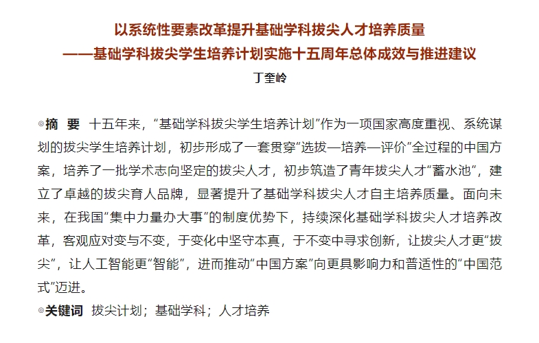 十五年來(lái),“基礎(chǔ)學(xué)科拔尖學(xué)生培養(yǎng)計(jì)劃”作為一項(xiàng)國(guó)家高度重視、系統(tǒng)謀劃的拔尖學(xué)生培養(yǎng)計(jì)劃,初步形成了一套貫穿“選拔—培養(yǎng)—評(píng)價(jià)”全過(guò)程的中國(guó)方案,培養(yǎng)了一批學(xué)術(shù)志向堅(jiān)定的拔尖人才,初步筑造了青年拔尖人...