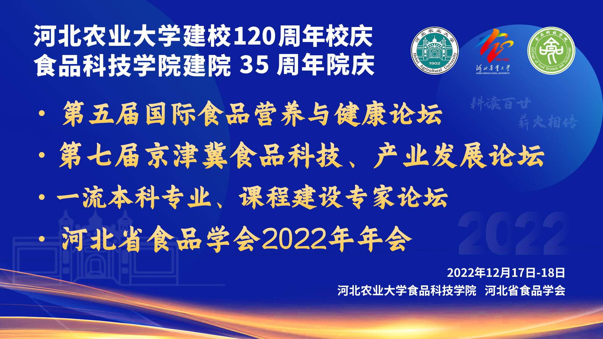 河北農(nóng)業(yè)大學(xué)建校120周年校慶、食品科技學(xué)院建院35周年院慶“學(xué)術(shù)論壇”系列交流活動(dòng)——第五屆國際食品營養(yǎng)與健康論壇;第七屆京津冀食品科技、產(chǎn)業(yè)發(fā)展論壇;一流本科專業(yè)、課程建設(shè)專家論壇;河北省食品學(xué)會(huì)...