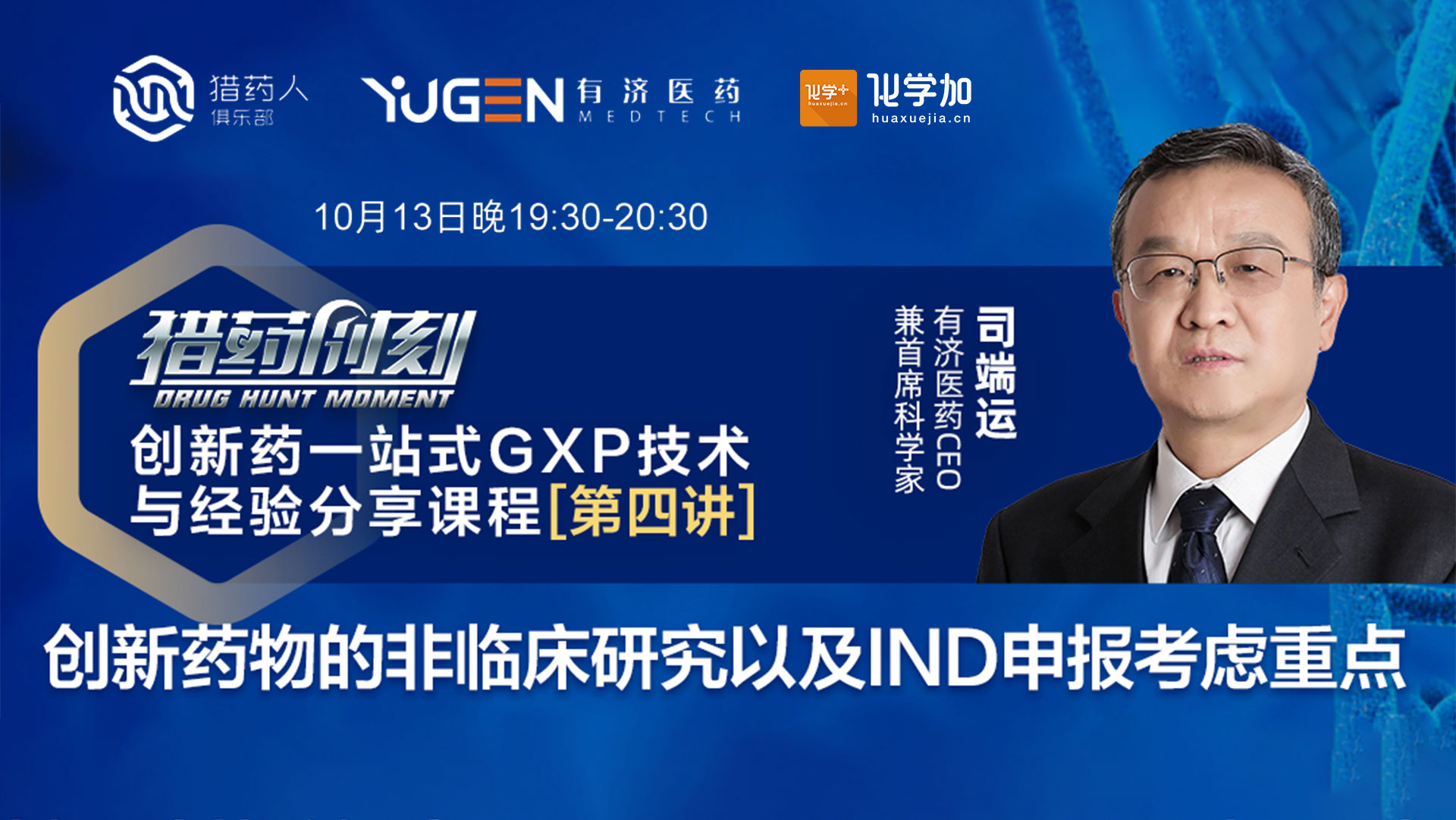 作為《創(chuàng)新藥一站式GXP技術(shù)與經(jīng)驗》分享課程的第四講,獵藥時刻欄目特邀天津有濟(jì)醫(yī)藥科技發(fā)展有限公司CEO兼首席科學(xué)家司端運博士于10月13日晚19:30帶來《創(chuàng)新藥物的非臨床研究以及IND申報考慮重點...