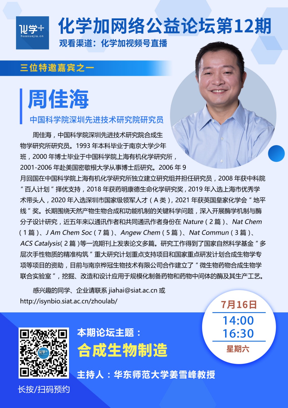 化學(xué)加網(wǎng)絡(luò)公益論壇第12期將于2022年7月16日(星期六)14:00-16:30舉行,我們很高興邀請到了中國科學(xué)院微生物研究所陳義華研究員、中國科學(xué)院深圳先進(jìn)技術(shù)研究院周佳海研究員、中國科學(xué)院深圳先...