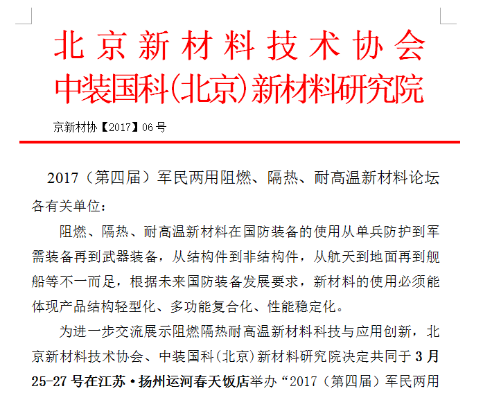 為進(jìn)一步交流展示阻燃隔熱耐高溫新材料科技與應(yīng)用創(chuàng)新,北京新材料技術(shù)協(xié)會(huì)、中裝國(guó)科(北京)新材料研究院決定共同于3月25-27號(hào)在江蘇·揚(yáng)州運(yùn)河春天飯店舉辦“2017(第四屆)軍民兩用阻燃、隔熱、耐高溫...