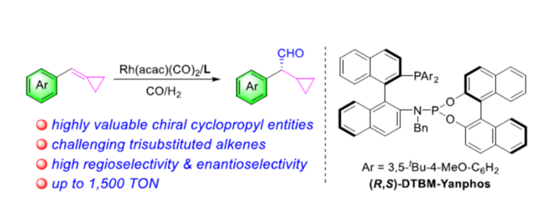 近日,南方科技大學(xué)張緒穆團隊報道了銠催化環(huán)丙基官能團化三取代烯烴的高度化學(xué)、區(qū)域和對映選擇性氫甲酰化反應(yīng),從而合成了一系列含有環(huán)丙基取代的手性醛衍生物。其中,使用改良的Yanphos配體,命名為(R,...