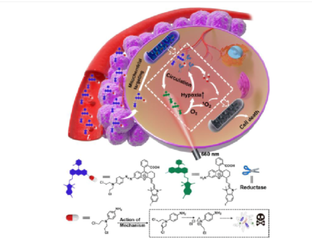 近期,湖南大學(xué)化學(xué)化工學(xué)院的袁林教授和張曉兵教授課題組報道了一種線粒體靶向分子前藥,將缺氧激活的前藥與PDT藥物相結(jié)合,可以在腫瘤缺氧條件下被選擇性激活,釋放化療藥物和光敏劑,并且由于在光照后加劇了細...