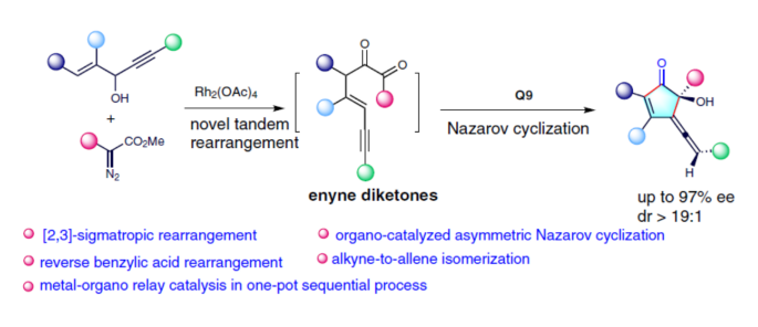 近日,常州大學(xué)孫江濤與唐生表課題組報道了一種涉及烯炔二酮的不對稱Nazarov環(huán)化反應(yīng),從而合成了一系列手性聯(lián)烯環(huán)戊烯酮衍生物,具有出色的非對映與對映選擇性以及良好的收率。機(jī)理研究表明,反應(yīng)涉及銠催化...