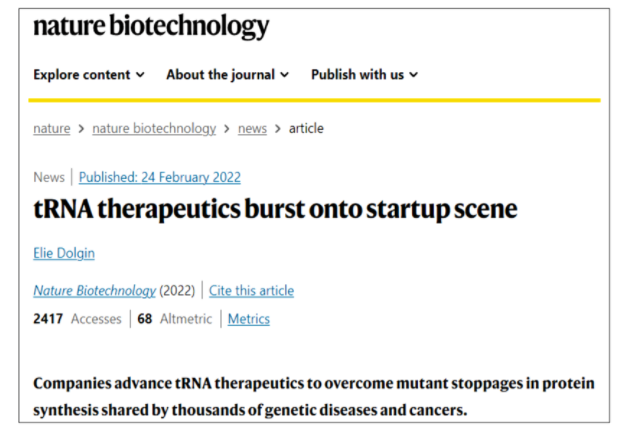 2022年2月24日,國(guó)際生物技術(shù)權(quán)威期刊《Nature Biotechnology》發(fā)表 “tRNA therapeutics burst onto startup scene”的新聞評(píng)論[1],講...