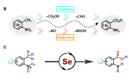 近日,華東師范大學(xué)姜雪峰教授課題組報(bào)道了一種硒催化的策略,可以將大量的鄰硝基甲苯直接轉(zhuǎn)化為具有重要生物學(xué)和藥學(xué)意義的鄰氨基苯甲酸(AA),而無需任何額外的還原劑、氧化劑和保護(hù)基,具有原子經(jīng)濟(jì)性和氧化還...