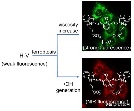 近日,中科院化學(xué)所馬會(huì)民研究員課題組在鐵死亡機(jī)制方面取得新進(jìn)展。他們利用自己設(shè)計(jì)的雙功能熒光探針(H-V)實(shí)現(xiàn)了鐵死亡過程中羥基自由基(?OH)產(chǎn)生和細(xì)胞粘滯度改變的同時(shí)檢測(cè),揭示了鐵死亡伴隨著羥基自...