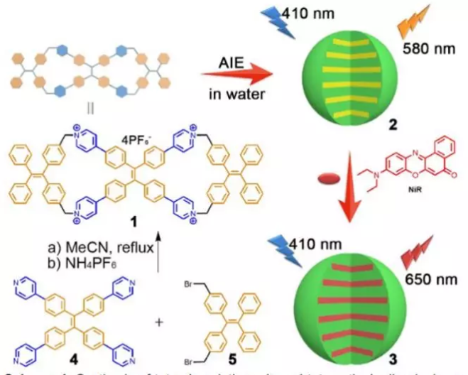 西北大學曹利平教授課題組報道了一鍋法合成含有四苯基乙烯結構的四陽離子二環(huán)蕃(1)及其具有聚集誘導發(fā)射(AIE)和集光功能的自組裝行為。經(jīng)X-射線晶體結構和HR-TEM確證,該四陽離子二環(huán)蕃可自組裝形成...