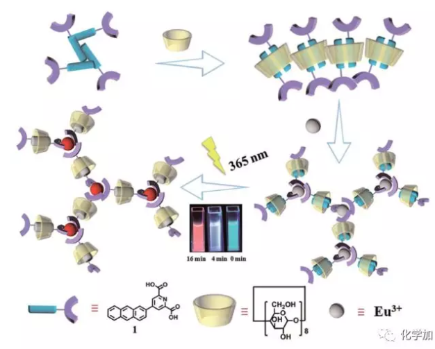 南開大學劉育教授利用主客體效應將蒽基二羧酸衍生物(1)與γ-環(huán)糊精(γ-CD)以2:1摩爾比自組裝,所得γ-CD.12再同Eu3+配位,得到光響應超分子組裝體Eu3+?γ-CD.12。憑借蒽基光二聚特...
