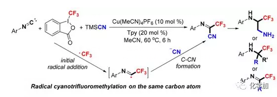 近日,華東理工大學(xué)劉培念教授課題組報(bào)道了一個(gè)多組分的異氰類化合物的氰基三氟甲基化反應(yīng);該反應(yīng)能通過一鍋法將CN和CF3兩種官能團(tuán)同時(shí)連接到同一個(gè)碳上,得到三氟甲基取代的腈類化合物。相關(guān)論文發(fā)表在Org...