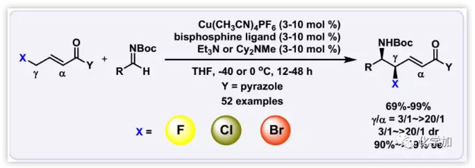 近日,中國(guó)科學(xué)院上海有機(jī)化學(xué)研究所殷亮研究員課題組在J. Am. Chem. Soc.報(bào)道了Cu(I)-催化的直接不對(duì)稱插烯γ-鹵素(F, Cl或Br)-α,β-不飽和N-?;吝蚝蚇-Boc-醛亞胺...