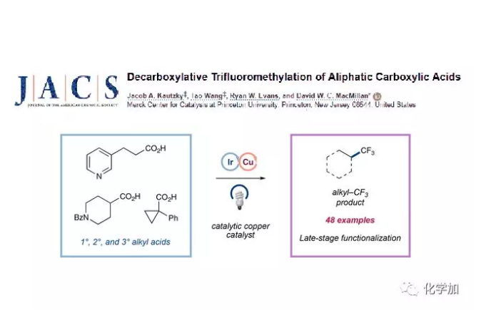 在分子結構中引入三氟甲基可以有效地改變分子的代謝穩(wěn)定性、膜滲透性。最近,普林斯頓大學的MacMillan教授報道了第一例Cu和光協(xié)同催化的烷基羧酸的三氟甲基化反應,文章DOI: 10.1021/jac...