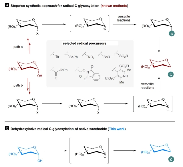 近日,蘭州大學(xué)舒興中教授課題組提出了一種通過天然糖苷C?OH鍵均裂生成糖基自由基的新方法,該方法利用鈦催化劑,可直接從天然糖生成糖基自由基,這些自由基與活性烯烴選擇性偶聯(lián),從而高效生成具有高立體選擇性...