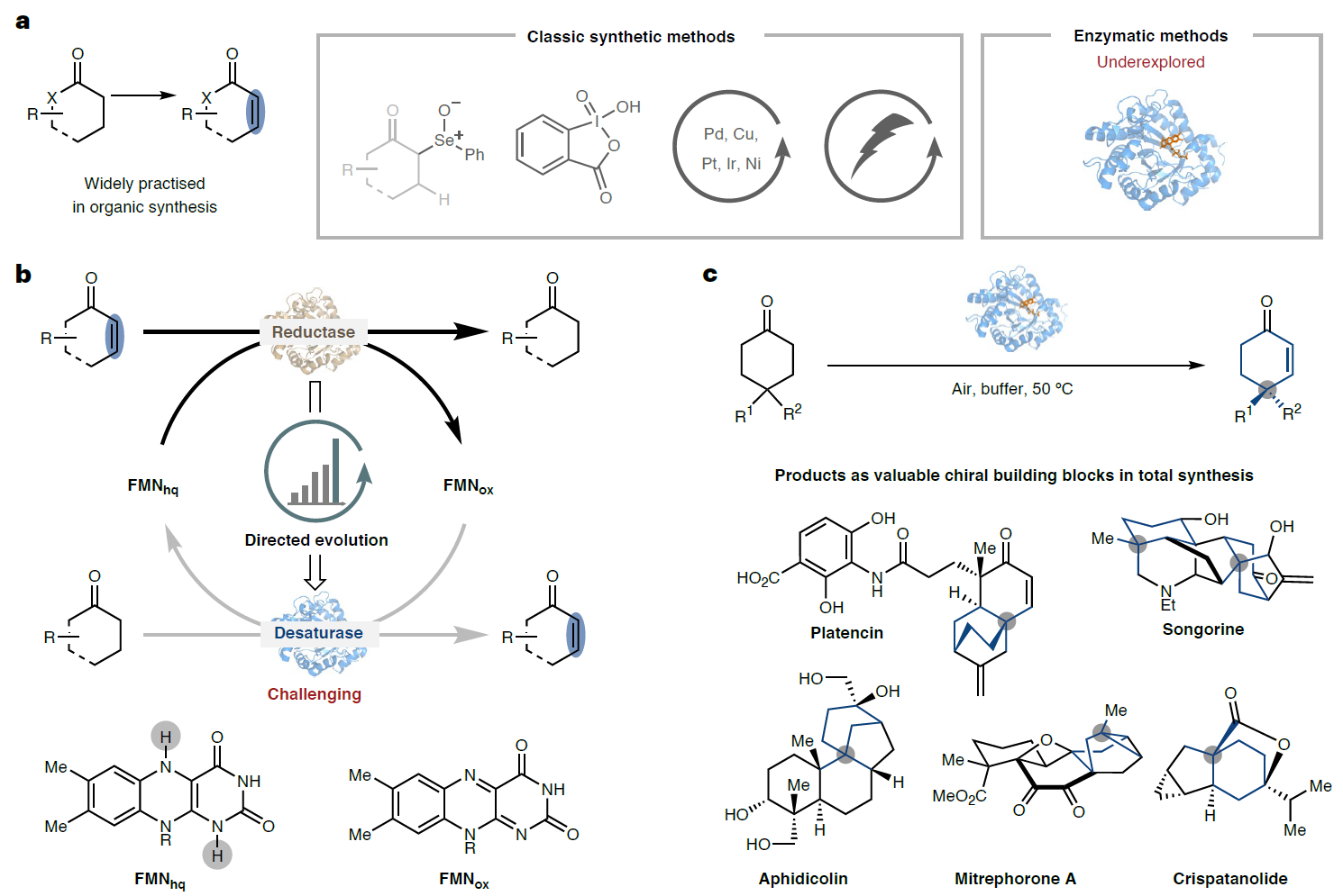 西湖大學(xué)葉宇軒課題組從一類底物范圍好、熱穩(wěn)定性高、易于表達(dá)的烯還原酶出發(fā),成功把其從還原酶改造成去飽和化酶 (圖1b),建立了一個通用的酶催化羰基去飽和化反應(yīng)平臺,合成了一系列含有遠(yuǎn)端四級手性中心的高...