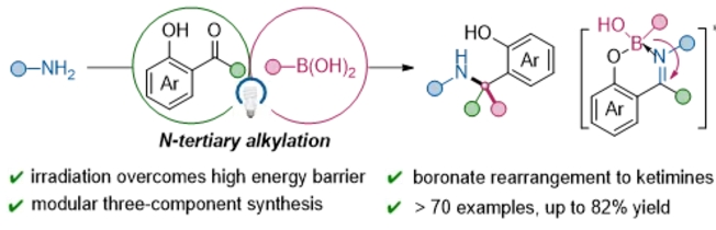α-叔胺作為藥物分子和生物活性分子的重要骨架,其合成一直是合成化學(xué)研究的熱點。傳統(tǒng)的N-叔烷基化反應(yīng)往往受到底物空間位阻大、反應(yīng)活化能壘高等因素的限制。為了解決這些問題,中國科學(xué)院上海有機化學(xué)研究所陳...