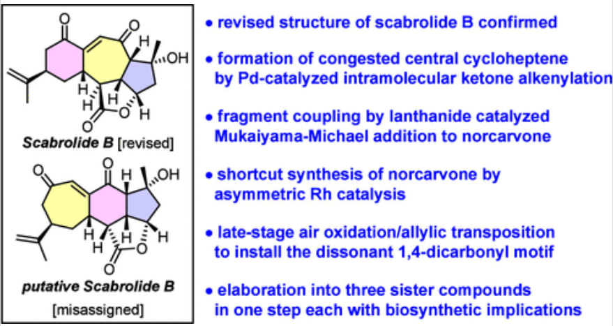 最近,化學(xué)家們發(fā)現(xiàn)降西松烷類(norcembranoids)化合物Scabrolides A和B具有明顯不同的碳三環(huán)骨架。因此,合成Scabrolide A的路線不能擴展到其衍生化天然產(chǎn)物的合成。近日...