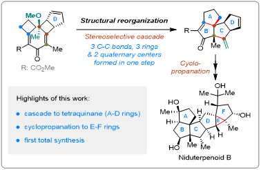到目前為止,精確、高效地構(gòu)建多環(huán)、多立體中心的復(fù)雜化學(xué)結(jié)構(gòu)依然是合成化學(xué)領(lǐng)域的研究熱點和難點。Niduterpenoid B是一類潛在的ERα抑制劑,具有復(fù)雜的全碳六環(huán)骨架和13個連續(xù)的手性中心,包括...