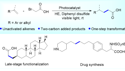 蘭州大學(xué)功能有機分子化學(xué)國家重點實驗室許鵬飛教授課題組在可見光催化未活化烯烴的氫羧甲基化反應(yīng)和通過雙功能氮中心自由基合成七元含氮雜環(huán)類化合物研究領(lǐng)域取得新進展,相關(guān)研究分別發(fā)表在CCS Chemist...