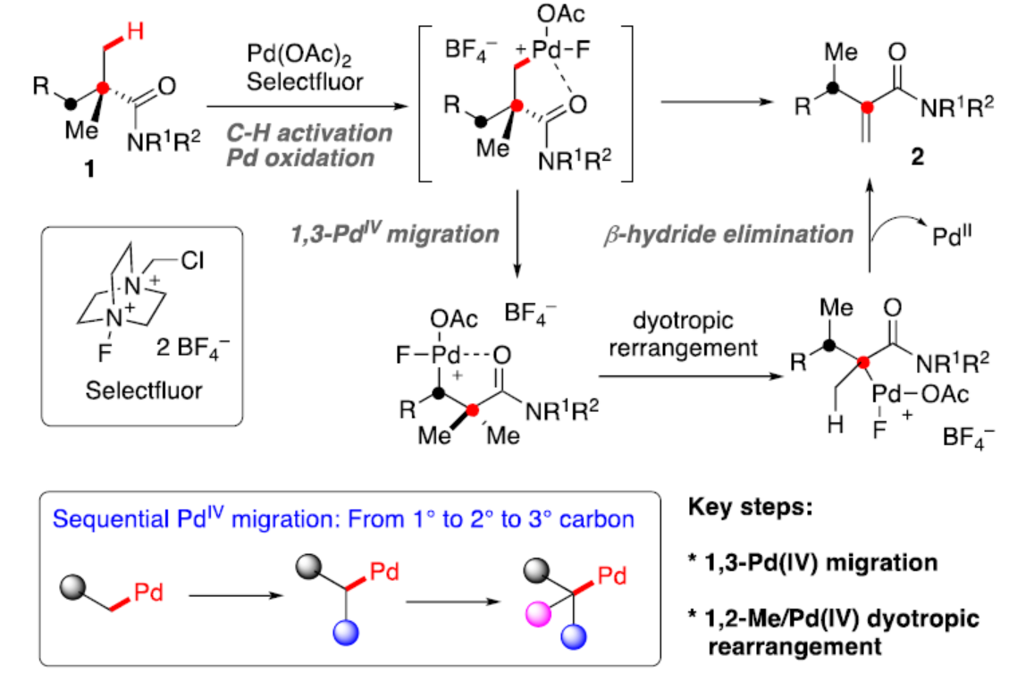 近日,瑞士洛桑聯(lián)邦理工學(xué)院祝介平課題組開發(fā)了一種新型的反應(yīng),其中連接到季碳上的甲基能夠遷移到其相鄰的仲碳上,季碳C?C單鍵同時氧化為C=C碳雙鍵。具體而言,在催化量的乙酸鈀、Selectfluor和碳...