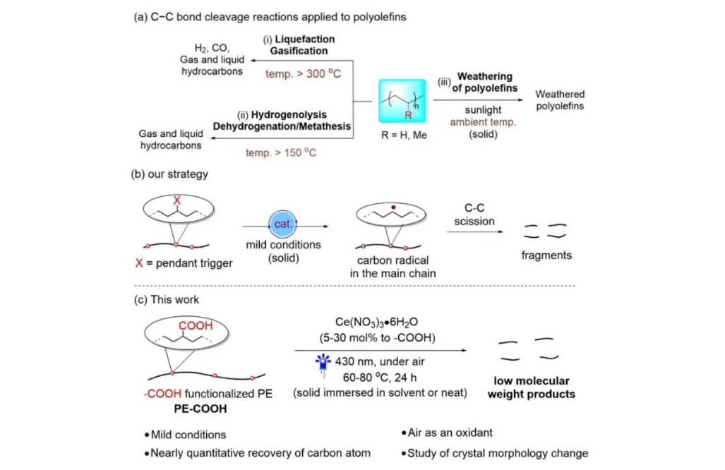開(kāi)發(fā)新型的廢聚烯烴高效降解和回收利用技術(shù),不僅能夠降低環(huán)境負(fù)荷,而且有望減少對(duì)化石資源的依賴。在本文中,東京大學(xué)Kyoko Nozaki教授課題組利用商業(yè)化的鈰催化劑,實(shí)現(xiàn)了含有少量羧酸基團(tuán)的晶態(tài)聚乙...