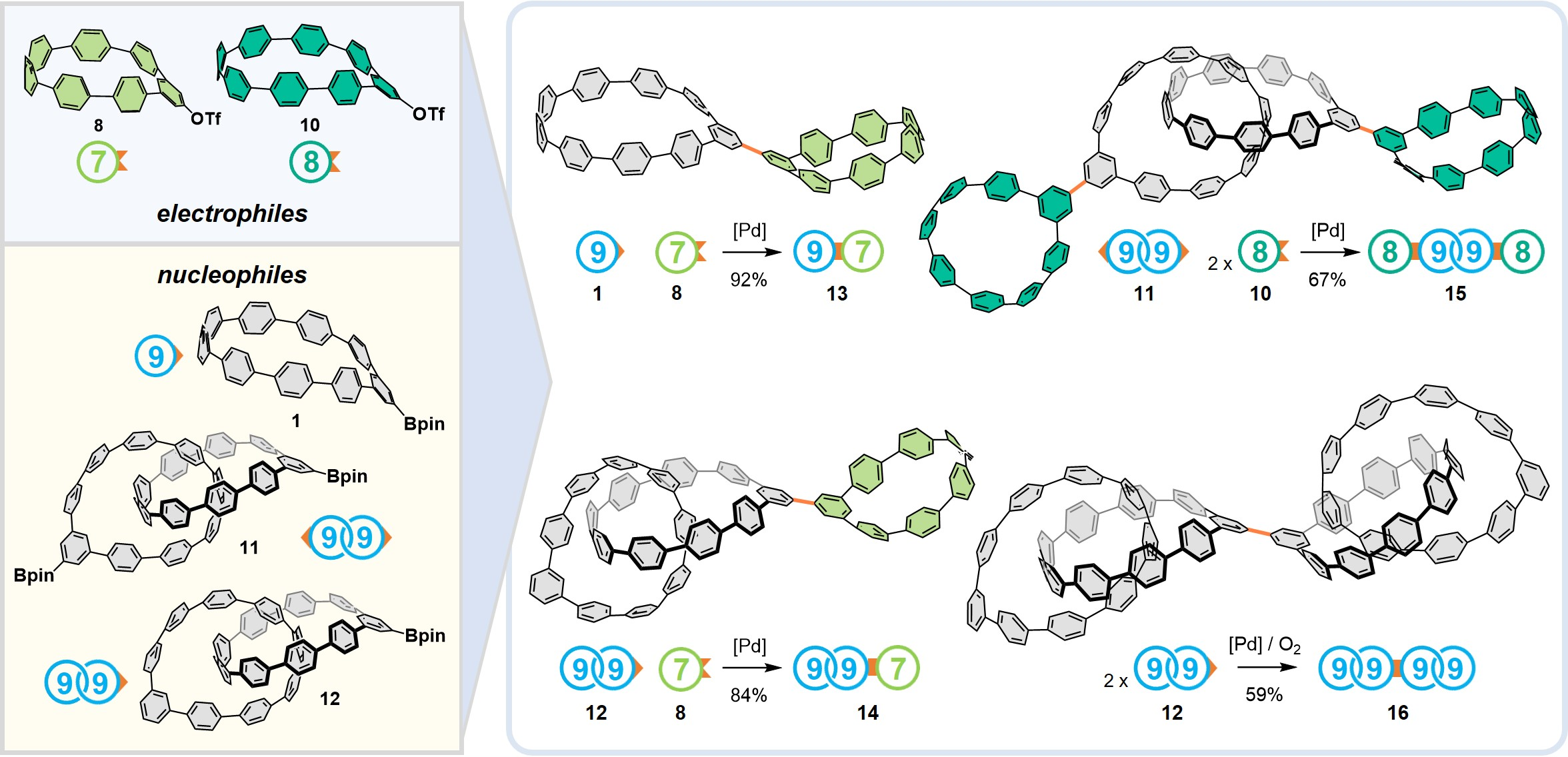 大環(huán)分子在分子納米拓?fù)鋵W(xué)領(lǐng)域中扮演著不可或缺的角色,通過化學(xué)鍵和機(jī)械鍵連接多個(gè)大環(huán)分子的策略已被證實(shí)是構(gòu)建新穎超分子結(jié)構(gòu)和分子機(jī)器的有效途徑。然而,對(duì)于不含雜原子的全苯大環(huán)拓?fù)浼{米碳,由于需要在克服分...