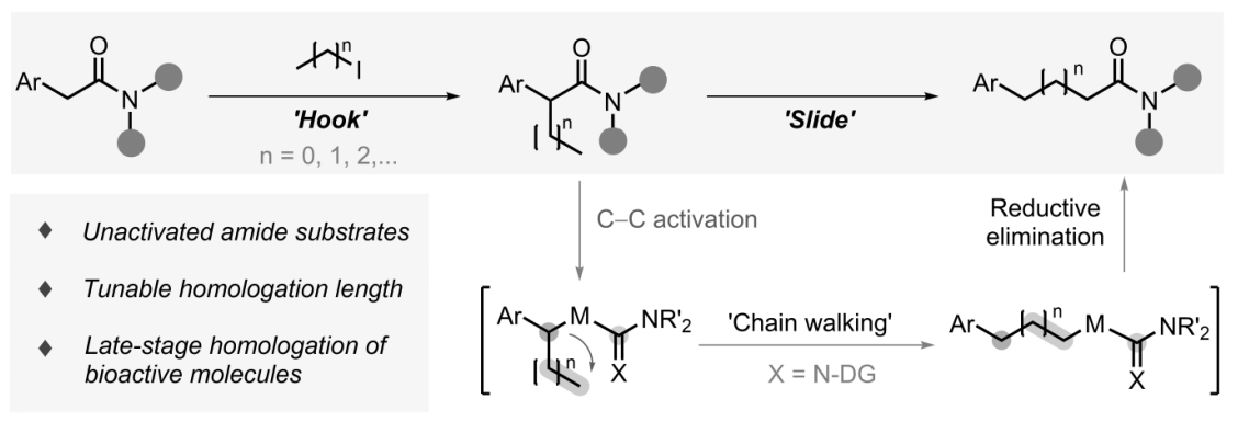 近日,美國(guó)芝加哥大學(xué)(University of Chicago)董廣彬課題組報(bào)道了一種“hook-and-slide”策略,實(shí)現(xiàn)了叔酰胺的可調(diào)控碳鏈長(zhǎng)度的同系化反應(yīng)。此轉(zhuǎn)化在酰胺的α-位實(shí)現(xiàn)烷基化(...