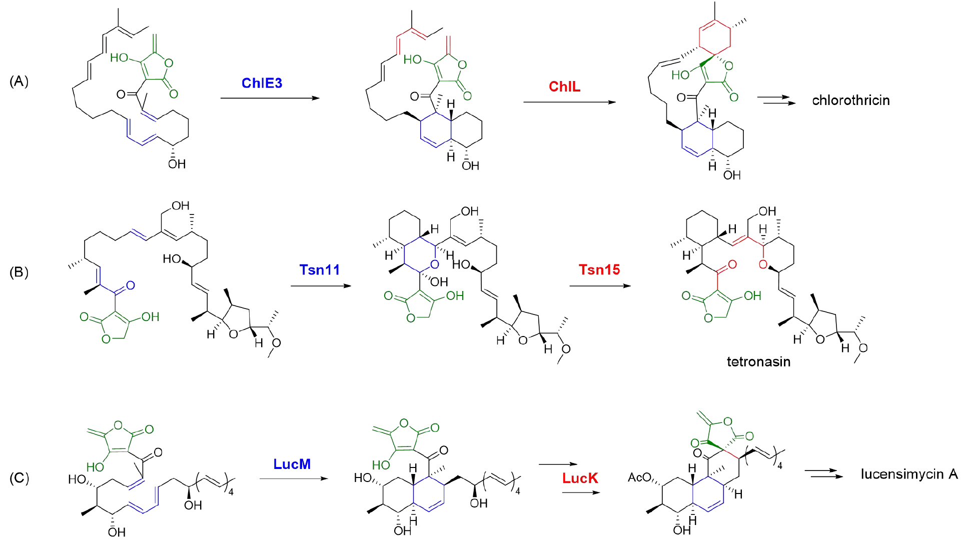 課題組聚焦非經(jīng)典tetronate天然產(chǎn)物lucensimycin A,開(kāi)展生物合成研究,通過(guò)體內(nèi)基因敲除、體外酶學(xué)表征、化學(xué)衍生化策略和結(jié)構(gòu)生物學(xué)手段,完整解析了其生物合成途徑,并揭示通過(guò)酶促立體選...