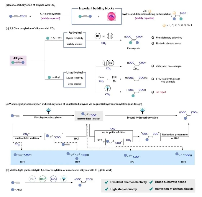 二氧化碳(CO2)作為一種無(wú)毒、廉價(jià)且可再生的理想C1合成子,其催化轉(zhuǎn)化制備高附加值羧酸,具有重要應(yīng)用價(jià)值,也存在反應(yīng)活性低和選擇性難調(diào)控等困難。另一方面,炔烴是一類(lèi)來(lái)源廣泛且容易獲得的有機(jī)化合物,利...
