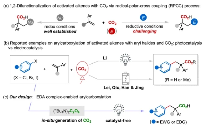以廉價(jià)易得的CO2為C1源,通過(guò)烯烴的芳羧基化反應(yīng)合成功能化羧酸是一種十分綠色高效的策略。通過(guò)自由基極性交叉偶聯(lián)(RPCC)策略實(shí)現(xiàn)CO2參與的烯烴雙官能化反應(yīng)已經(jīng)被很多課題組研究并報(bào)道。然而,當(dāng)使用...