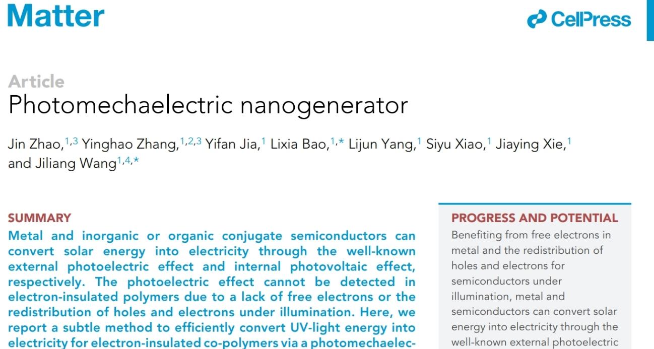 近日,云南大學(xué)化學(xué)科學(xué)與工程學(xué)院高分子系包黎霞、王繼亮課題組在Cell的姊妹刊Matter上在線發(fā)表了一篇題為“Photomechaelectric Nanogenerator”的Discovery研...