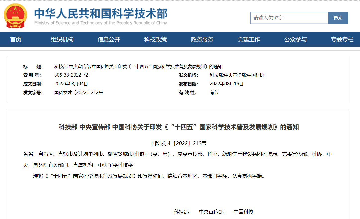 近日,科技部 中央宣傳部 中國(guó)科協(xié)關(guān)于印發(fā)《“十四五”國(guó)家科學(xué)技術(shù)普及發(fā)展規(guī)劃》的通知,推進(jìn)新時(shí)代科普事業(yè)發(fā)展。...